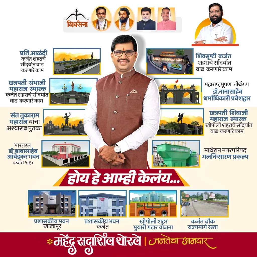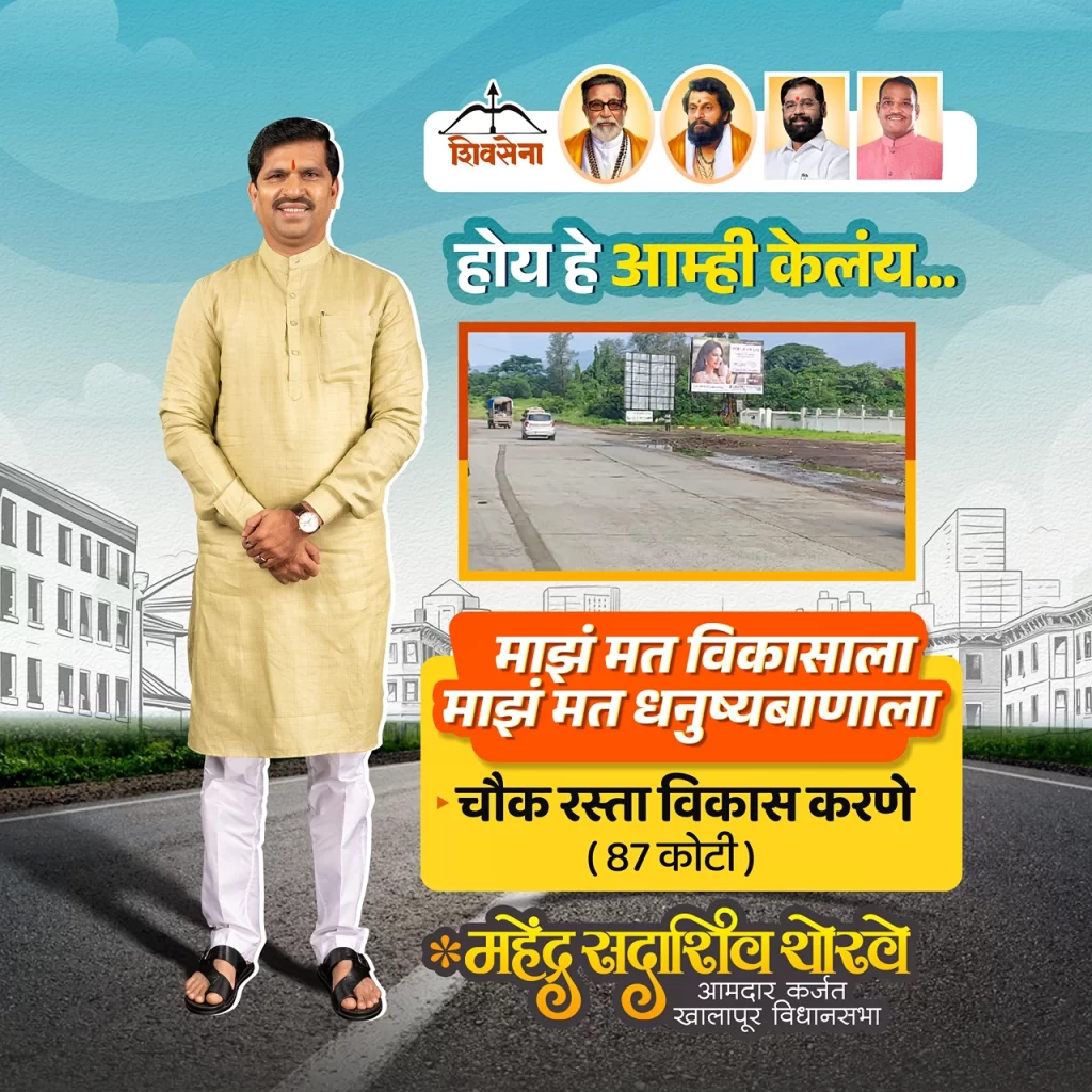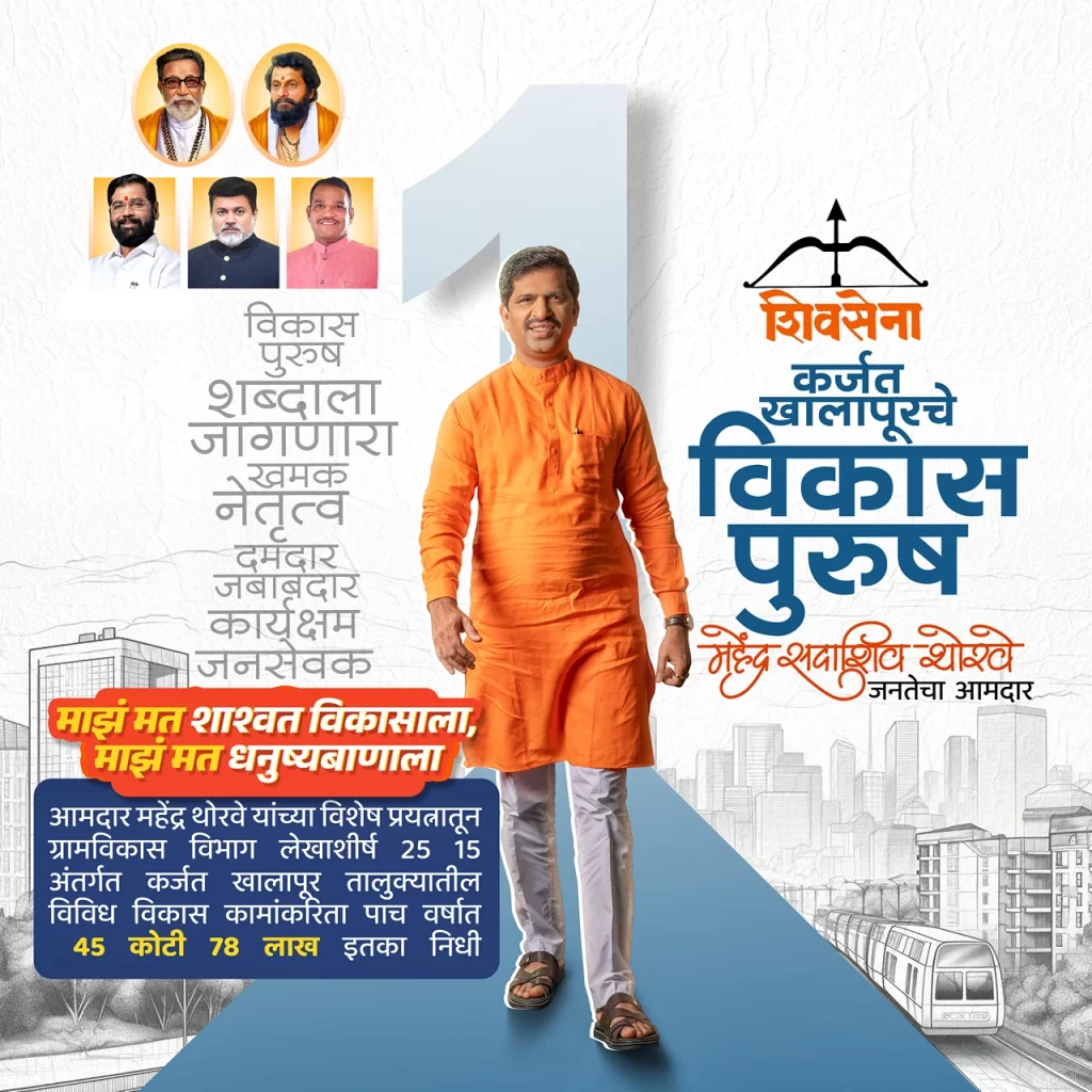 विविध विकासकामे, ‘मुख्यमंत्री – लाडकी बहीण योजना’, ‘नळपाणी योजना’, ‘ग्राम सडक योजना’ यासारख्या लोकोपयोगी योजनांची प्रभावी अंमलबजावणी करून. कर्जत खालापूरचा भविष्यवेधी आमदार म्हणून, महेंद्र थोरवे ह्यांनी जनतेच्या मनात घर केले. त्यांनी, इथल्या तरुणांसाठी नोकरी मेळावा भरवला, आणि तब्बल १२०० तरुणांना नोकरी मिळवून दिली. ह्या नोकरी मेळाव्याच्या माध्यमातून त्यांनी तरुणांना सुरक्षित भविष्य देण्याचे महत्वाचे काम केले.